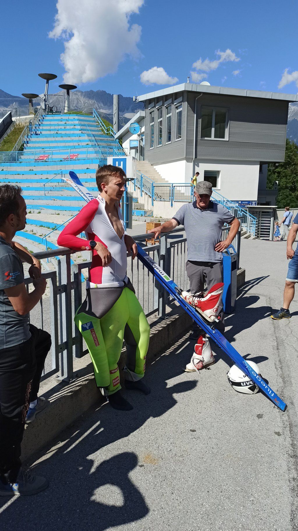 liegt bei 138m! Im Stadion finden 28'000 Zuschauer Platz. Die Skispringer erreichen beim Absprung eine Geschwindigkeit von ca. 100 km/h. Dass wir die Skispringer aus unmittelbarer Nähe verfolgen konnten, war sensationell und unvergesslich. Dank äusserst interessierten Männerturnern war die Diskussion mit den Skispringern sehr kurzweilig und spannend.