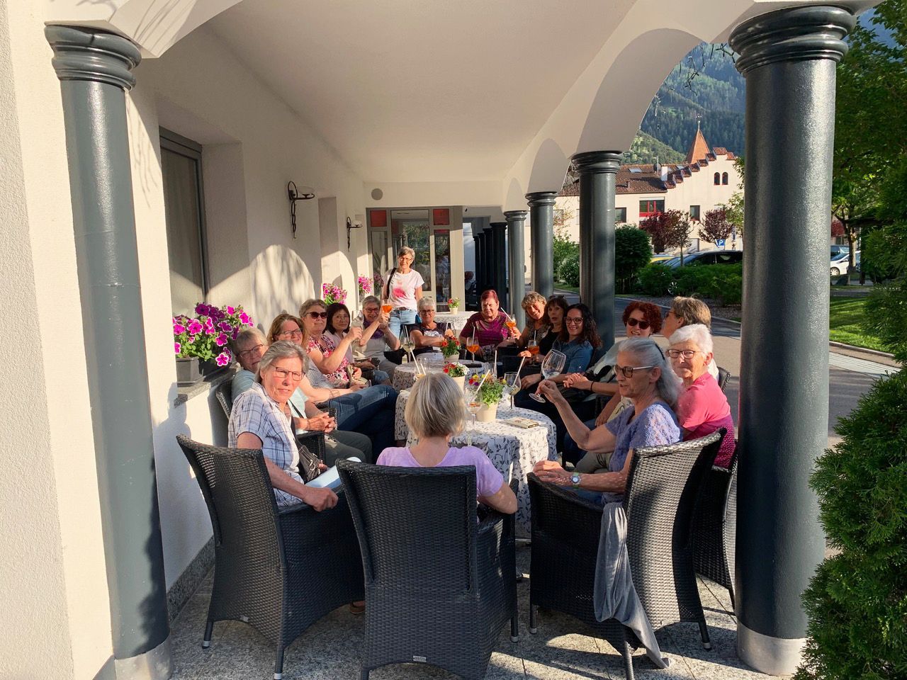 Die Velofahrerinnen werden mit dem Car in die Nähe von Bozen chauffiert. Dort starte die Radtour auf dem alten Bahntrassee durch Tunnels und entlang vieler Rebberge Richtung Kaltern. Nach dem Mittagsrast im Innenhof eines alten Weingutes und einer kurzen Dorfbesichtigung erwartet uns Walter mit seinem Car für die Rückfahrt zum Hotel. Nach dem wiederum sehr schmackhaften Essen geniessen wir den warmen Abend bei einem «Schlumi». Natürlich ist unsere gutgelaunte Runde nicht zu überhören, worauf der Hausherr uns ermahnt: «Wenn die Frauen zu laut kacheln (=kichern) kimmt’s zu regnen. Was es dann kurze Zeit darauf auch tut, allerdings war in der Ferne schon länger Donnergrollen zu hören.