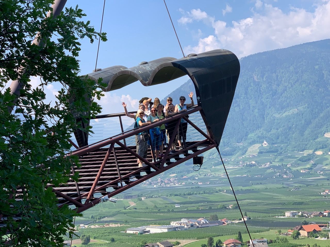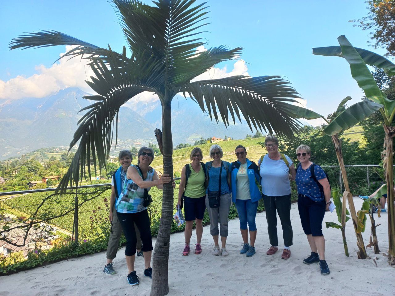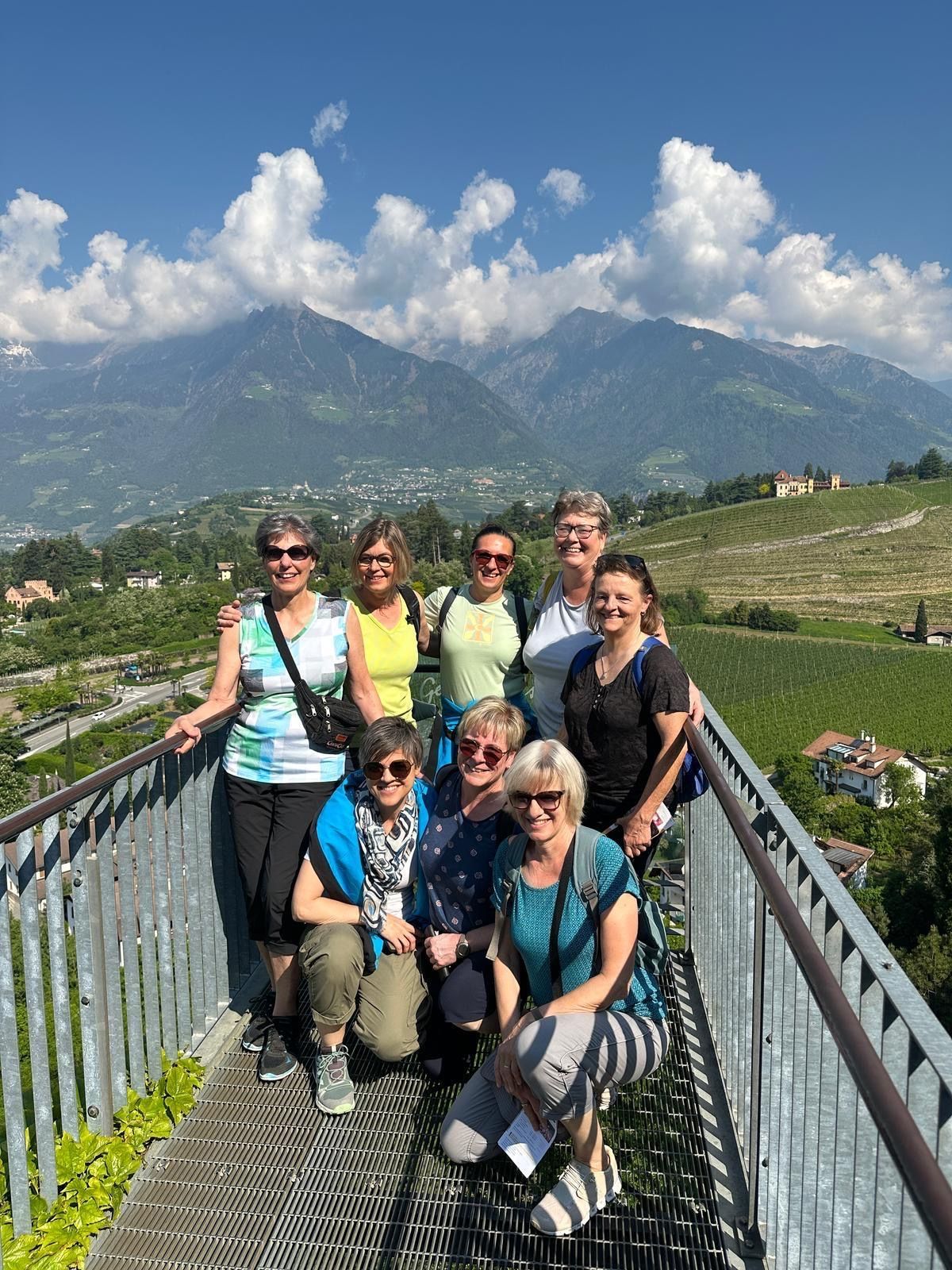 10 Turnerinnen schweben mit der Luftseilbahn nach Unterstell. Von da startet unsere 3-stündige Wanderung auf dem «Meraner-Höhenweg». Wir werden mit einer wunderschönen Aussicht auf das Meranerland belohnt. Zwischendurch stärken wir uns mit einem kleinen Schluck «Appenzeller».