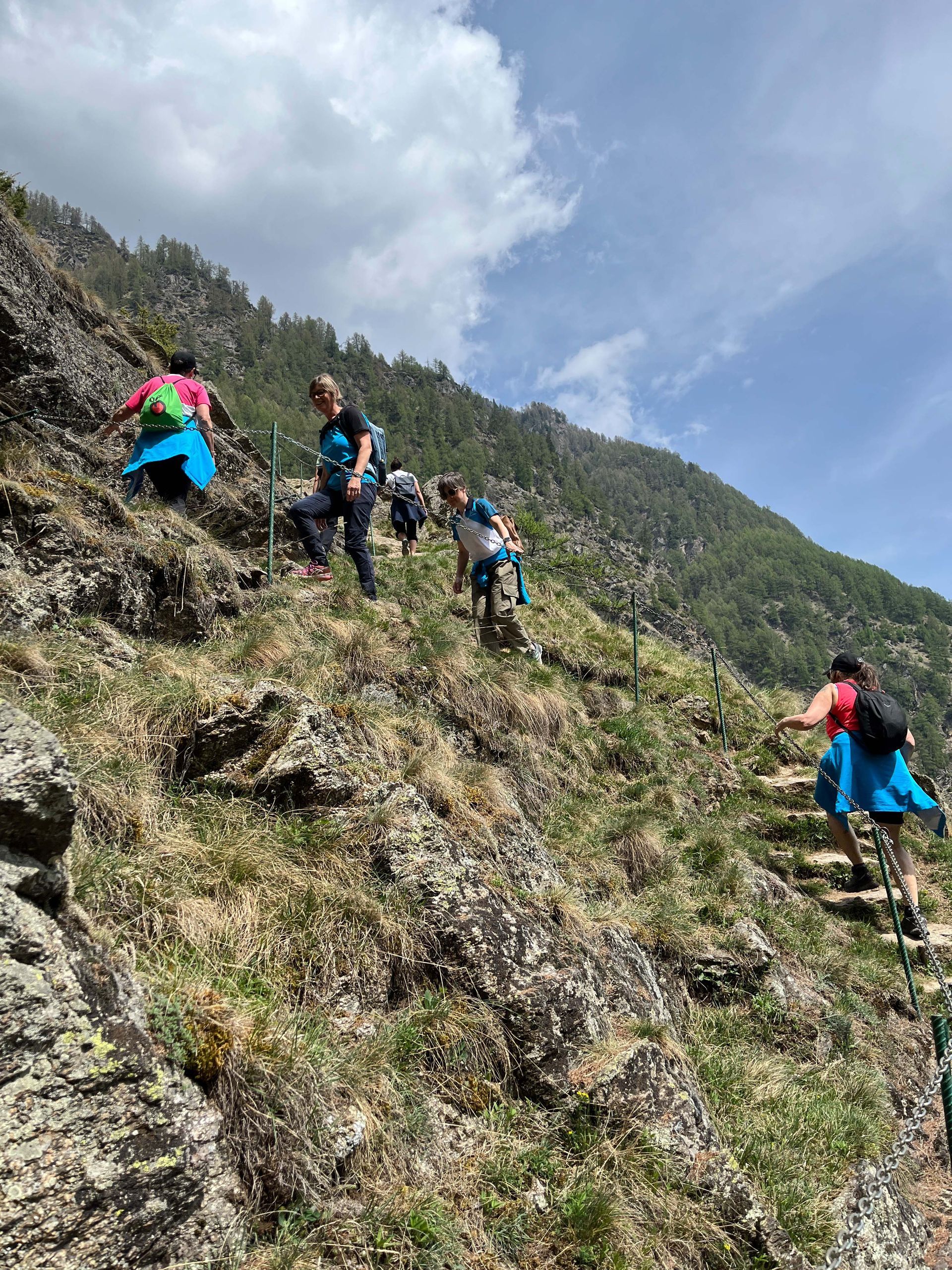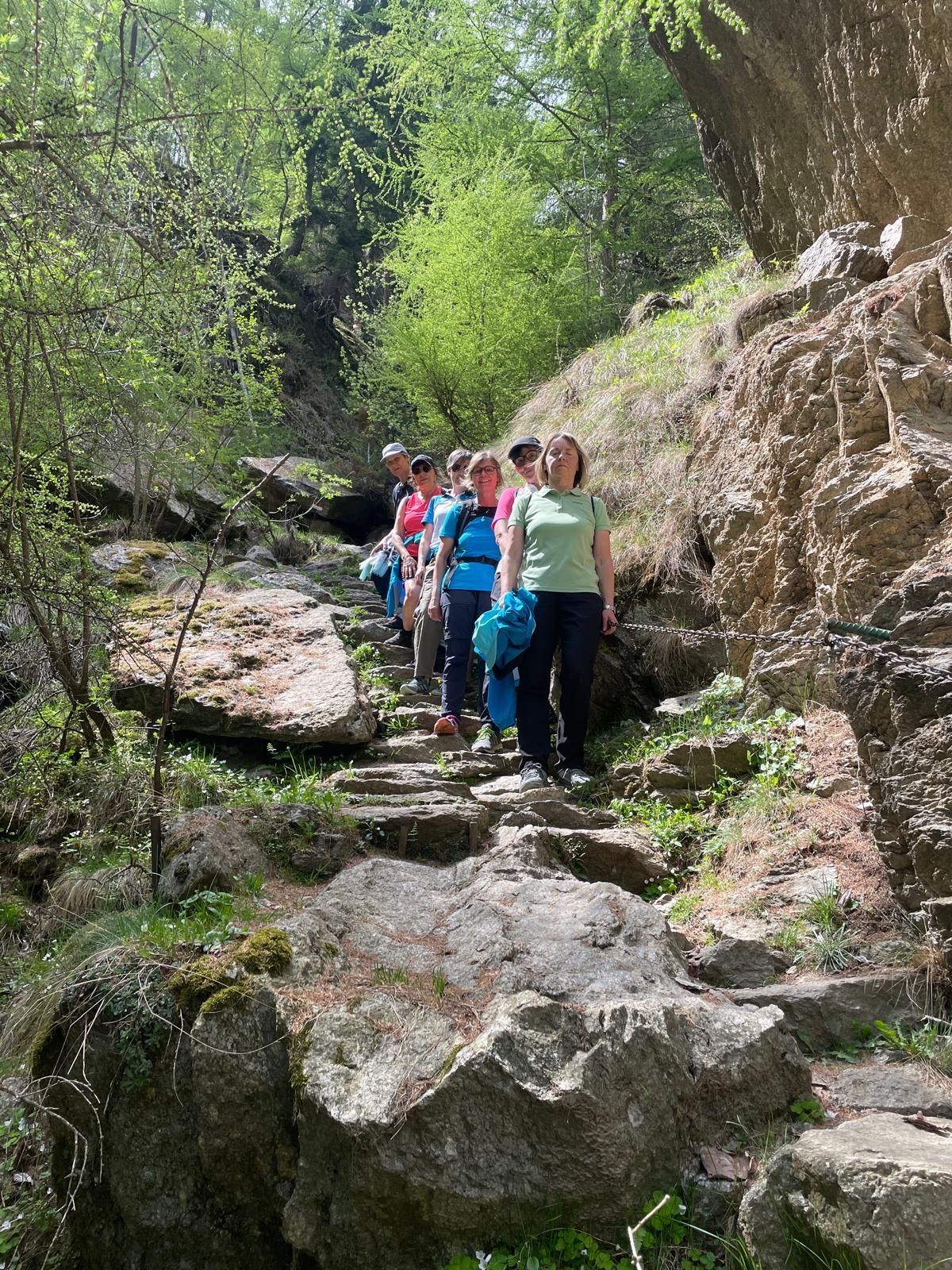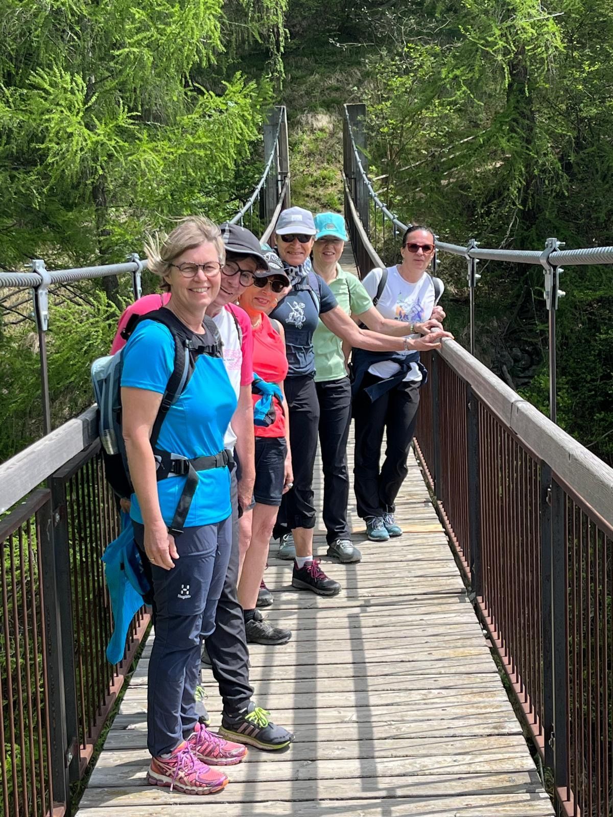 10 Turnerinnen schweben mit der Luftseilbahn nach Unterstell. Von da startet unsere 3-stündige Wanderung auf dem «Meraner-Höhenweg». Wir werden mit einer wunderschönen Aussicht auf das Meranerland belohnt. Zwischendurch stärken wir uns mit einem kleinen Schluck «Appenzeller».
